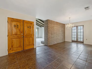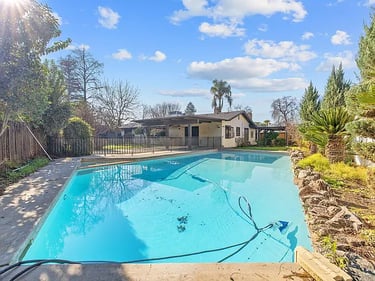 The charming front courtyard and mature landscaping create a warm first impression, while inside you'll find spacious living areas highlighted by vaulted, open-beam ceilings and a brick fireplace that anchors the main living room. Large windows bring in natural light and views of the lush grounds, enhancing the home's comfortable, classic feel. The kitchen retains its original charm with abundant cabinetry and functional layout, ready for everyday living or future customization. Bedrooms are well-sized, offering flexibility for family living, guests, or home office space. The home offers a whole-house fan and a convenient central vacuum system. Step outside to discover a backyard designed for both relaxation and entertaining. The expansive lot features a covered patio, mature trees, and a sparkling pool—perfect for warm Central Valley days. With ample space for gardening, play, or expansion, this property offers rare versatility. Located in a quiet, established neighborhood with pride of ownership, this home combines space, character, and opportunity—an ideal setting to create lasting memories.